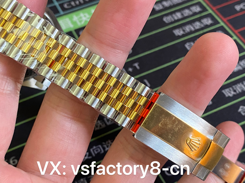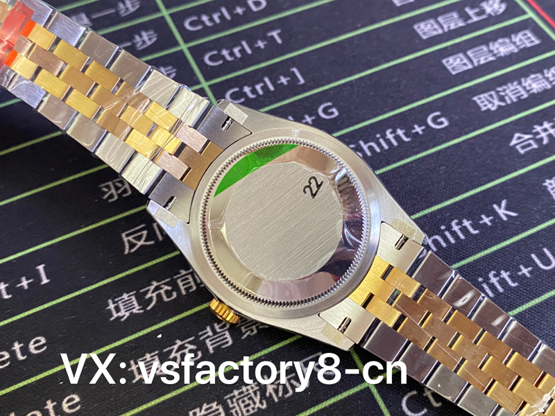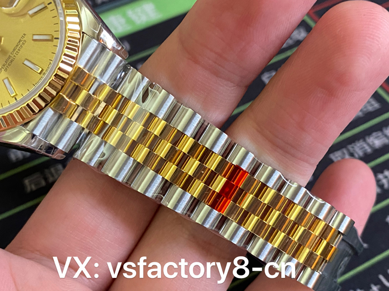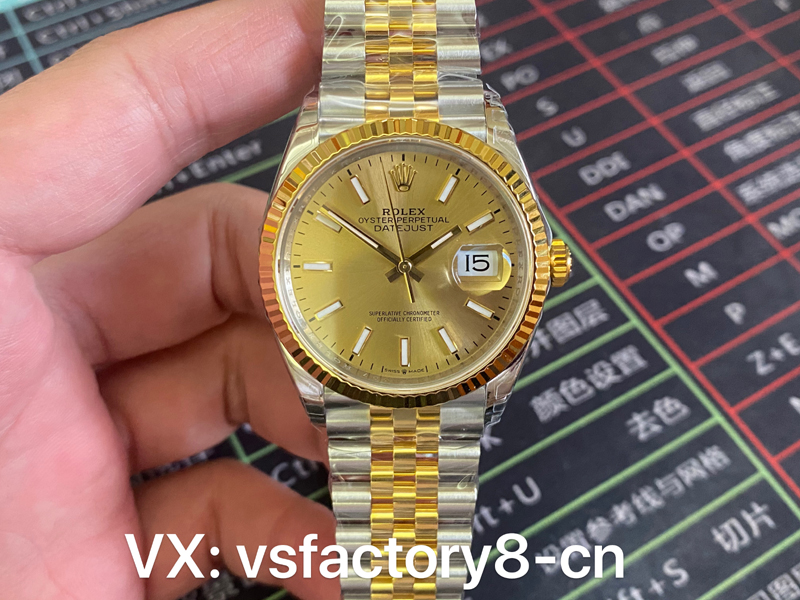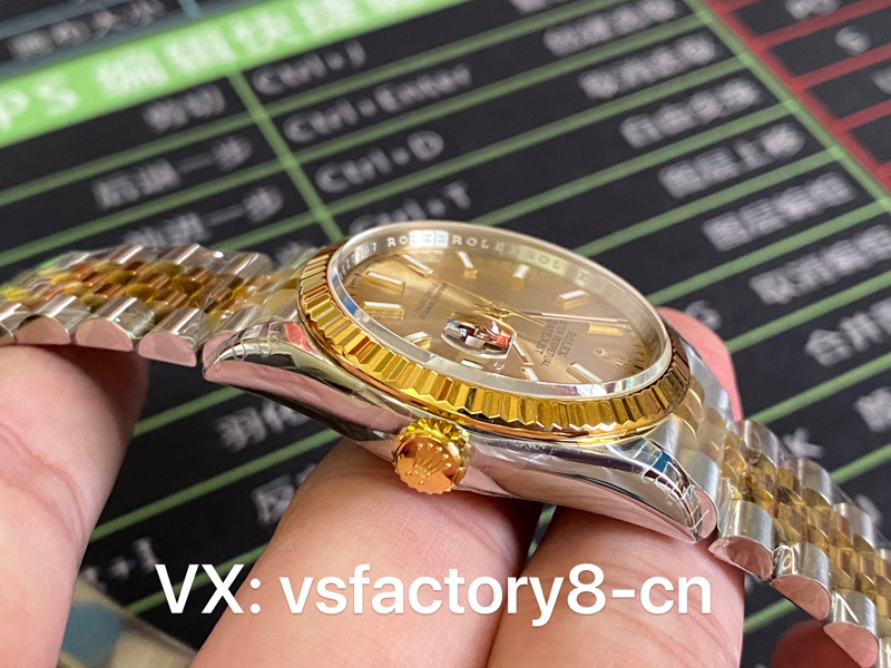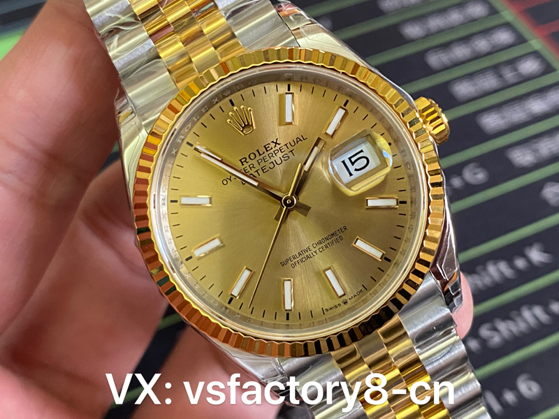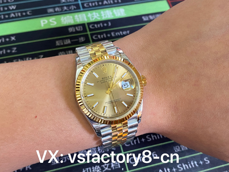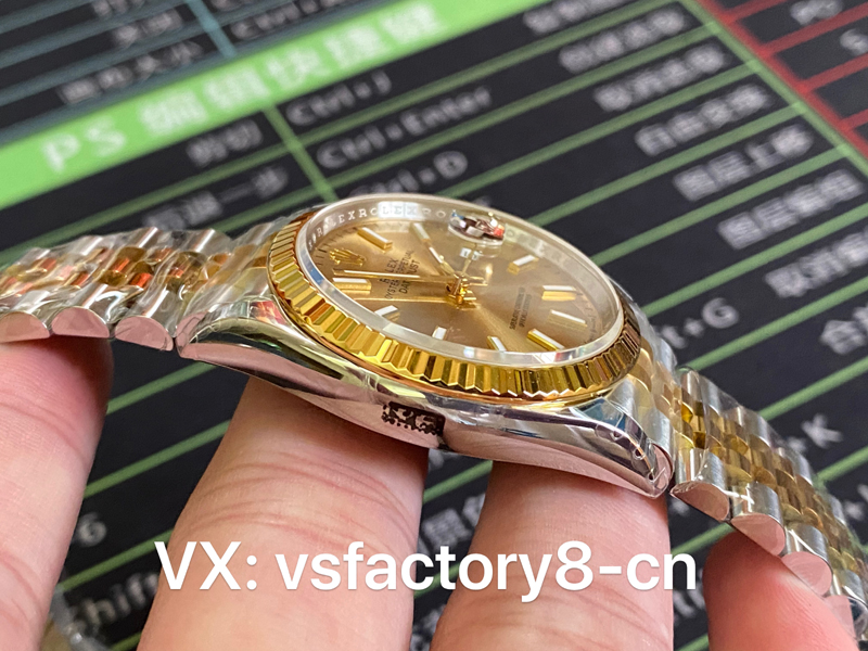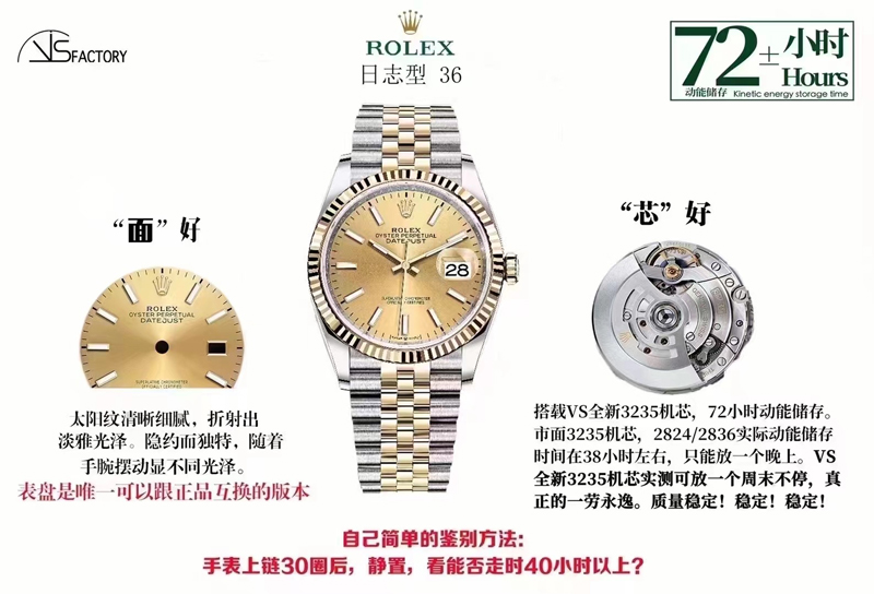 VS厂手表劳力士间金日志36M“面”好,表盘太阳纹清晰细腻,淡雅光泽,隐约而独特,随着手腕摆动显不同光泽,表盘是唯一可以跟正品互换的版本。