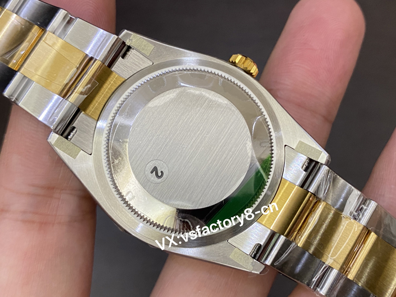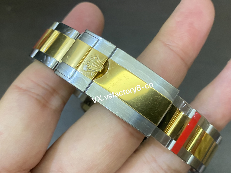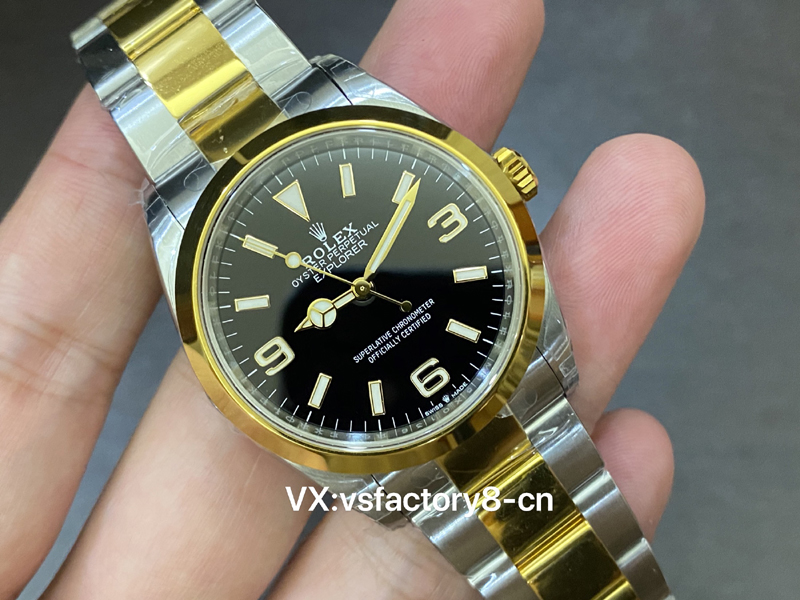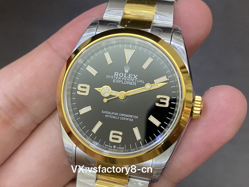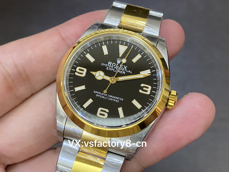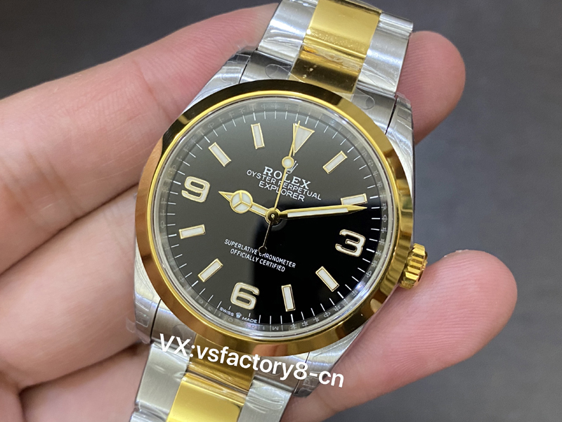 VS厂复刻表劳力士间金探险家采用904L精钢钢与真空电镀18K斤材质,其中外圈、表冠与表带中间链节采用18K金真空电镀打造而成。