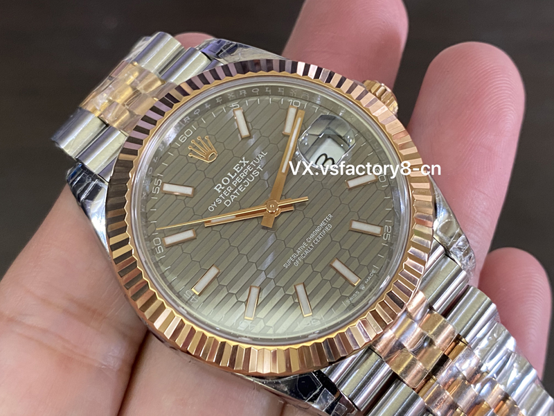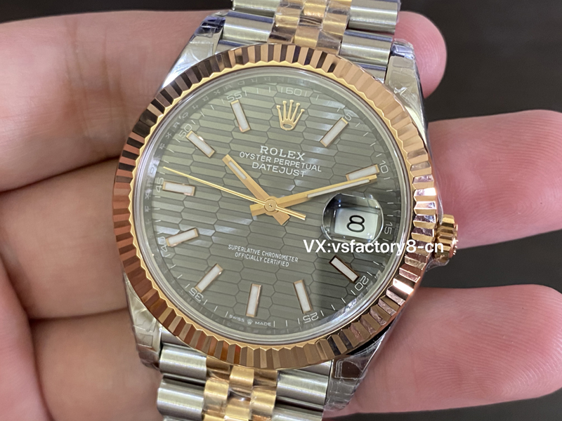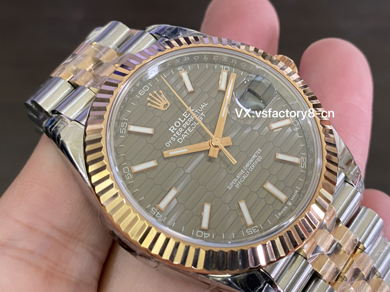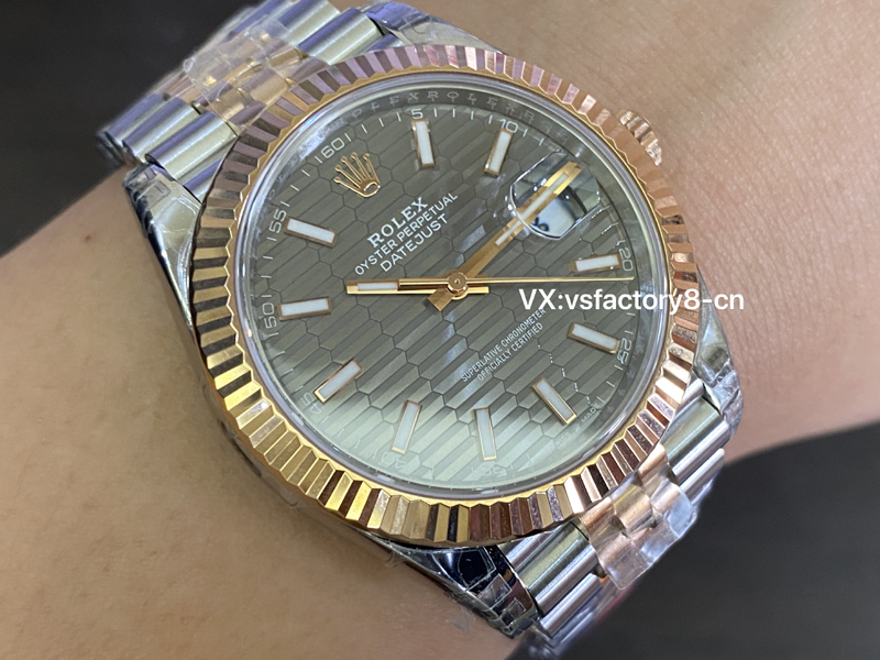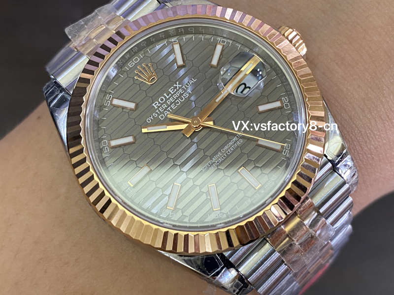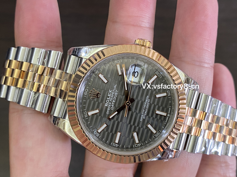 VS厂劳力士41m间玫瑰金石板灰水纹面日志搭载丹东一体3225机芯,唯一72动能储存版本。而且质量稳定,几乎不用返修售后。