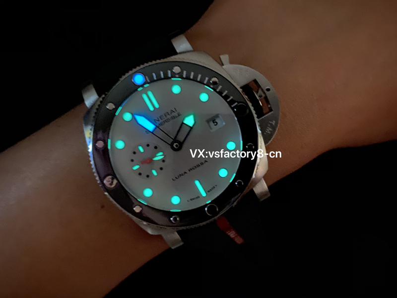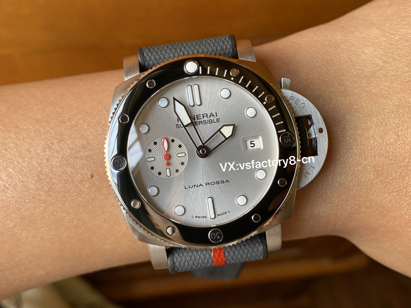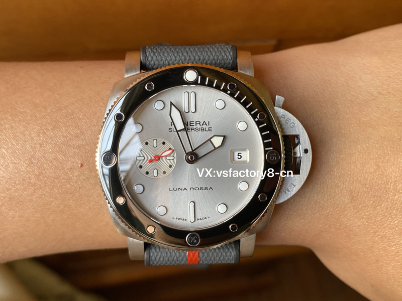 5:表盘方面,VS厂沛纳海PAM1681的设计采用经典的银色太阳放射纹表盘,做到了完全对版,表盘饰有“Luna Rossa”字样,指针与时标均涂覆Super-LumiNova®夜光涂层,最引人瞩目的工艺特点则是小秒盘上的环形雕纹。利用特殊工具在表盘凿刻数圈同心圆,并且搭载了红色的小秒针,非常的醒目,盘面英文字体细节上处理的很到位,也做实了此款复刻表是最高版本。