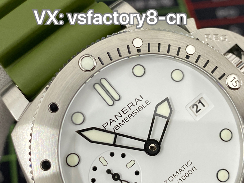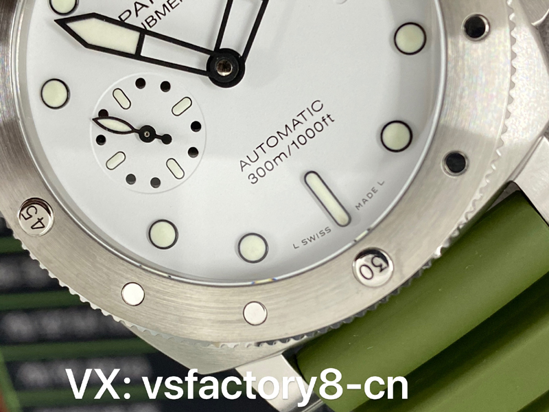 5:VS厂沛纳海PAM1226的表盘复刻还原设计简洁而富有层次感,复刻还原一致白色搪瓷表盘设计,质感上非常强烈,而且其复刻一致“三明治”结构,则是三点位置日历窗,九点位置小秒针盘,指针和刻度都均打磨圆润,填充了瑞士夜光粉涂层,夜光的效果与原同步,表盘的英文印刷字体细节也很到位,的的确确是非常值得入手。