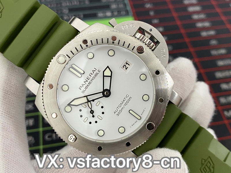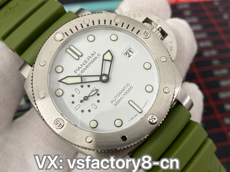 VS厂在沛纳海pam1226表盘上也是非常高还原,还原了正品一致白色盘面,也是做到了无色差现象,三点位置设有日历窗,九点位置设有小秒针盘,指针和刻度边缘进行的镀黑还原,并且均填充了瑞士夜光粉涂层,效果原版一致,表盘英文印刷字体非常细腻,同时也可以看出VS厂对细节做工还原非常用心。