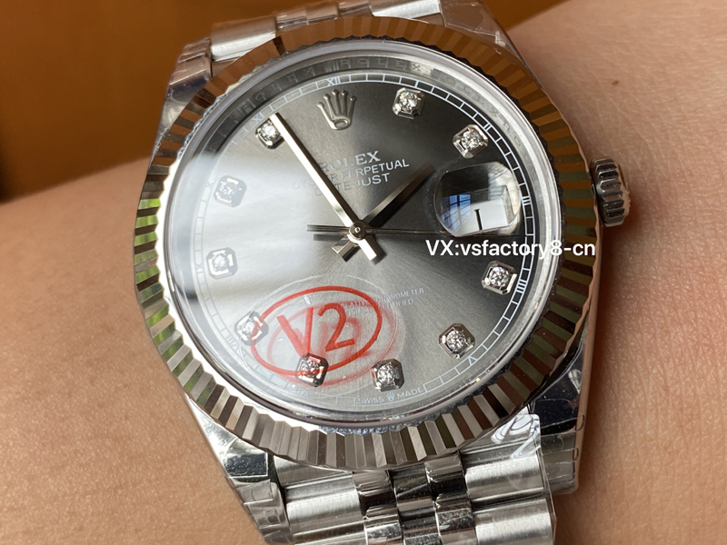 最引起广泛关注的还是表盘还原,VS厂在表盘上根据原版一致开发放射纹灰面盘,并且表盘上的刻度则采纳了台湾莫桑钻,并非皓石充当,做到了正版一致闪亮光泽,深邃的灰色调与钻石时标的结合,非常的响亮,尤其是在阳光的照射下,灰色的表面呈现出令人惊叹的光影变化,做到了原汁原味,指针上边缘打磨圆润,十二点刻度大皇冠LOGO非常立体,盘面英文印刷细节很精湛,VS厂确实在细节做工还原非常高。