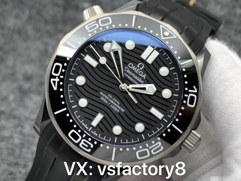 VS厂欧米茄海马300米潜水表系列,自动机械表男表43.5mm全陶瓷表壳,黑色陶瓷潜水刻度单向旋转表圈,防划蓝宝石玻璃镜面,黑色波纹表盘,自动上弦8806机械机芯,黑色表扣,黑色橡胶表带 。