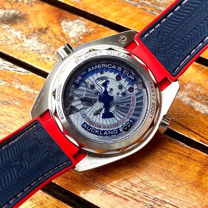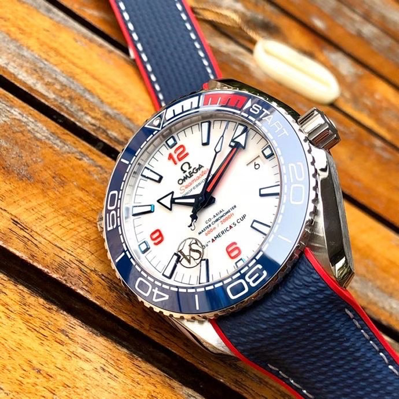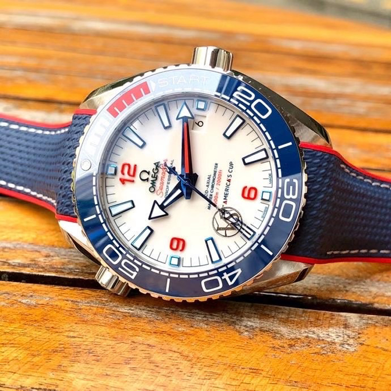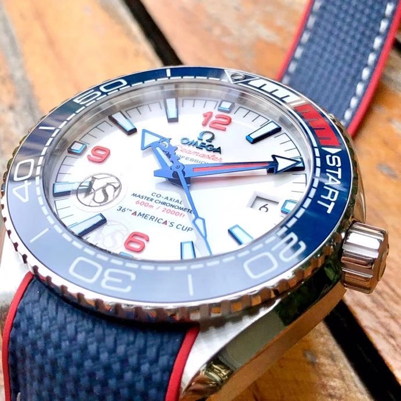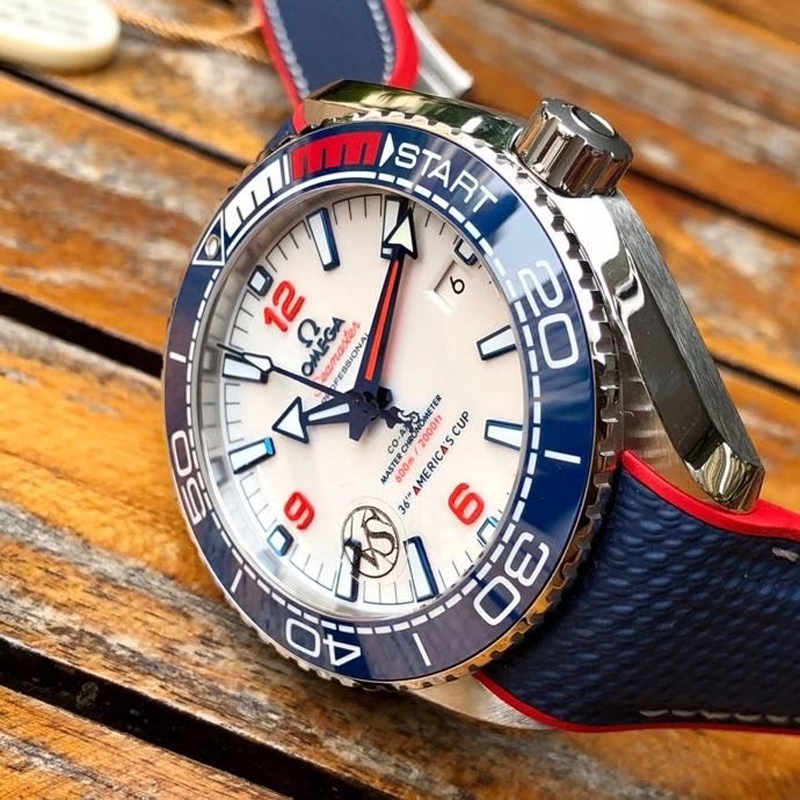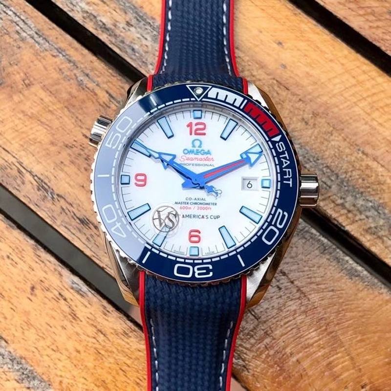 VS厂手表欧米茄43.5MM复刻表旨在致敬美洲杯帆船赛,欧米茄海马表壳为不锈钢材质打造,表圈的蓝色则是蓝色氧化锆 (ZrO2) 也就是陶瓷表圈。