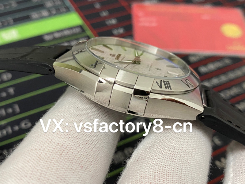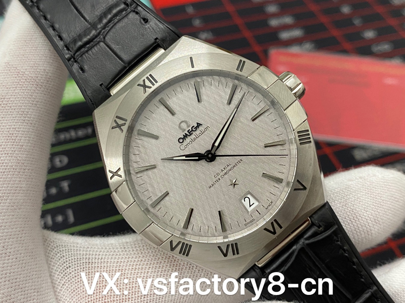 VS厂欧米茄星精钢圈缎纹面星座指针、欧米茄品跑标识、星徽标识以及拱形小时刻度均经过黑化处理、盘面丝缎压纹铑灰色表盘,不同角度看,不一样的感觉。