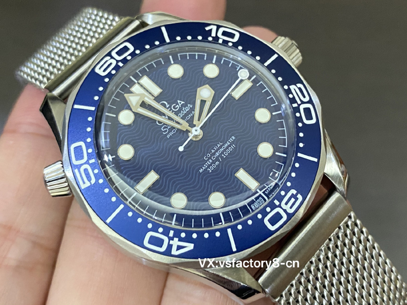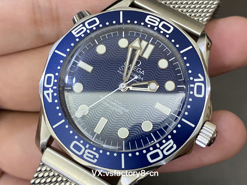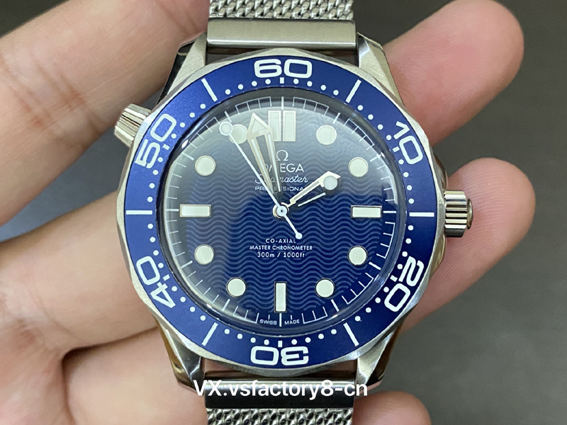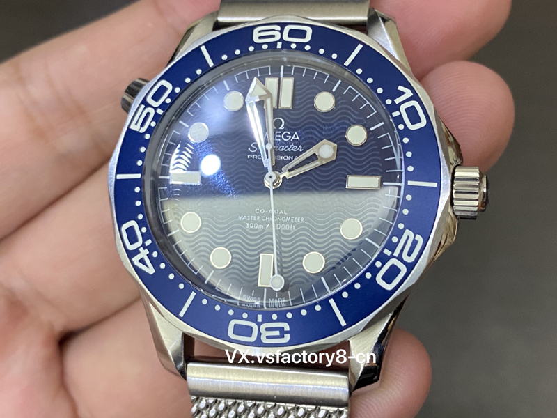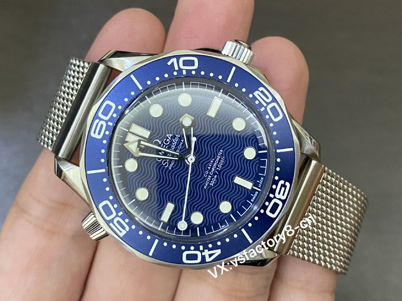 VS厂复刻表欧米茄无暇赴死60周年海马300米系列210.30.42.20.03.002复刻表,采用跟正品一致精钢表壳表链,蓝色表盘以草酸阳极氧化铝制成,饰以激光镌刻波纹图案。