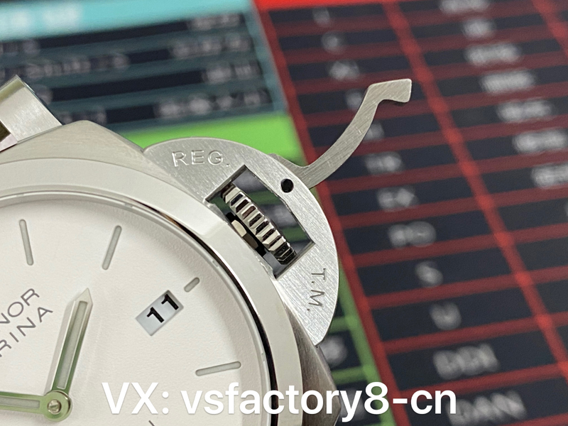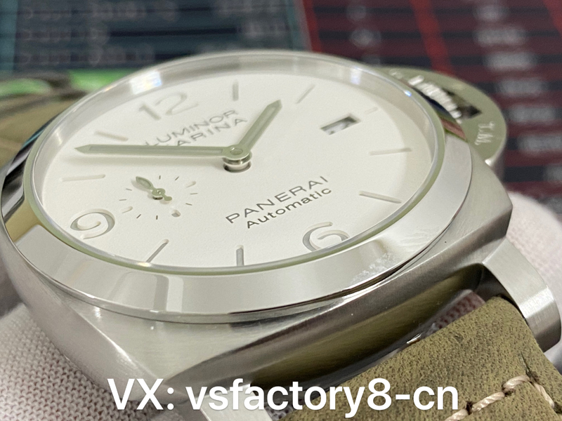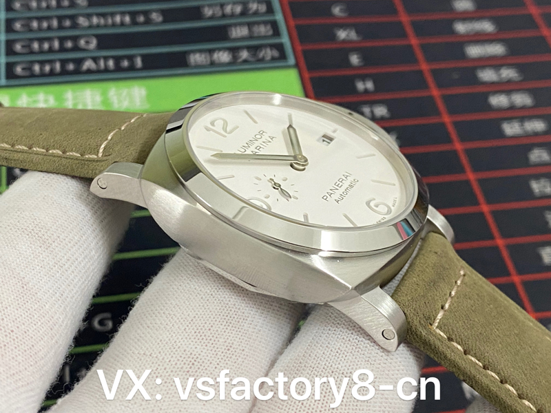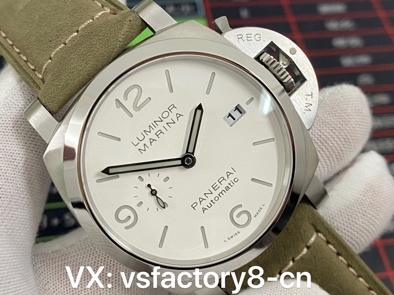 VS厂沛纳海复刻表1314表盘选用小三针设计,小秒盘设于9点钟方位,日历窗设于3点钟方位,这种布局也是沛纳海非常常见的一种,指针和时标均为灰色,和白色表盘和谐搭!