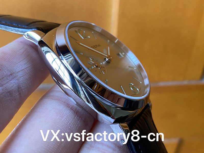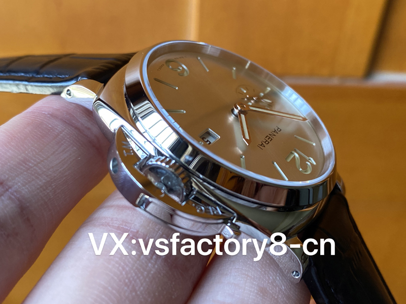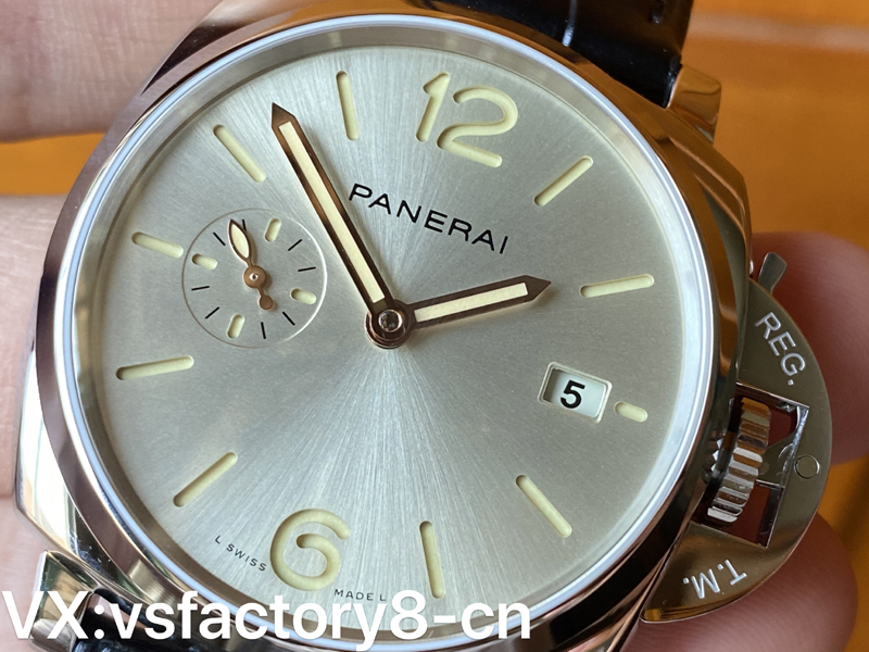 VS厂沛纳海pam1294表盘数字与小时标示涂覆白色Super-LumiNovaTM夜光涂层,在暗处显示绿色夜光,金色调指针同样涂覆白色Super-LumiNovaTM夜光涂层,有助于提高清晰与可见度。