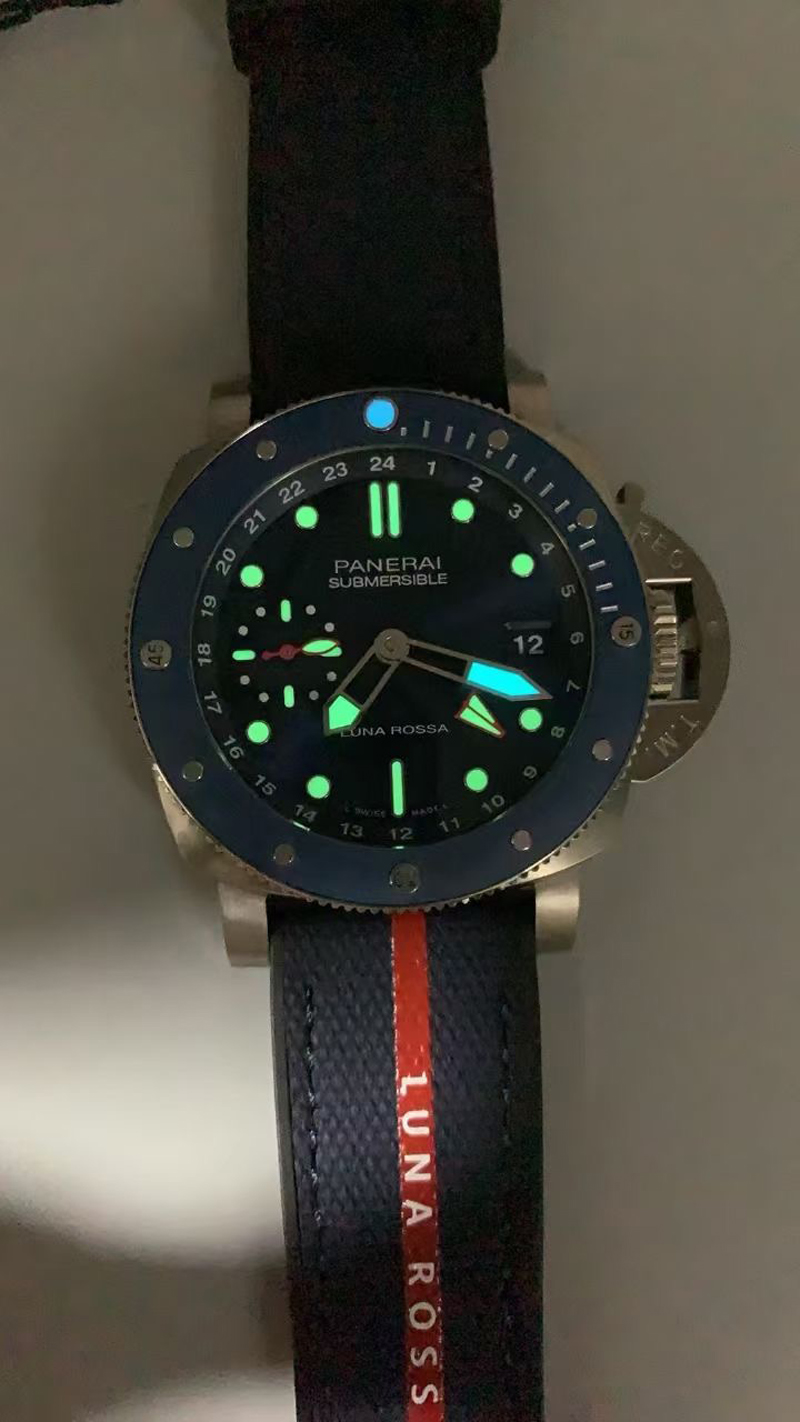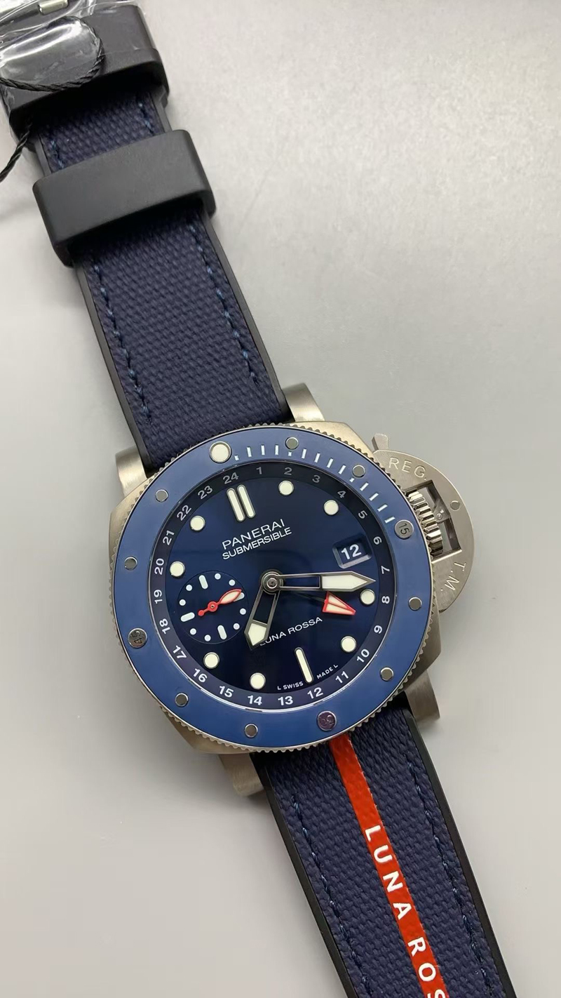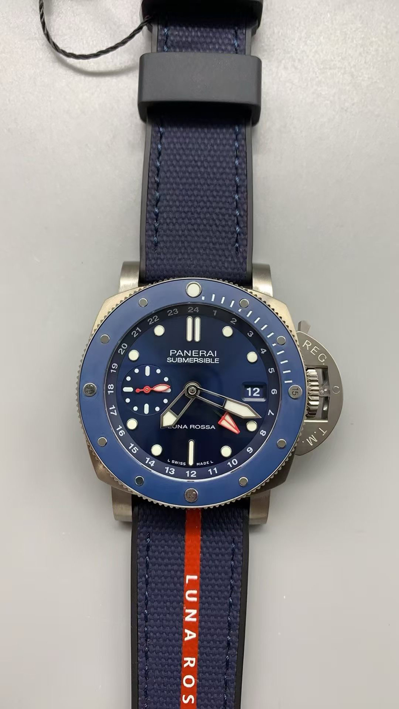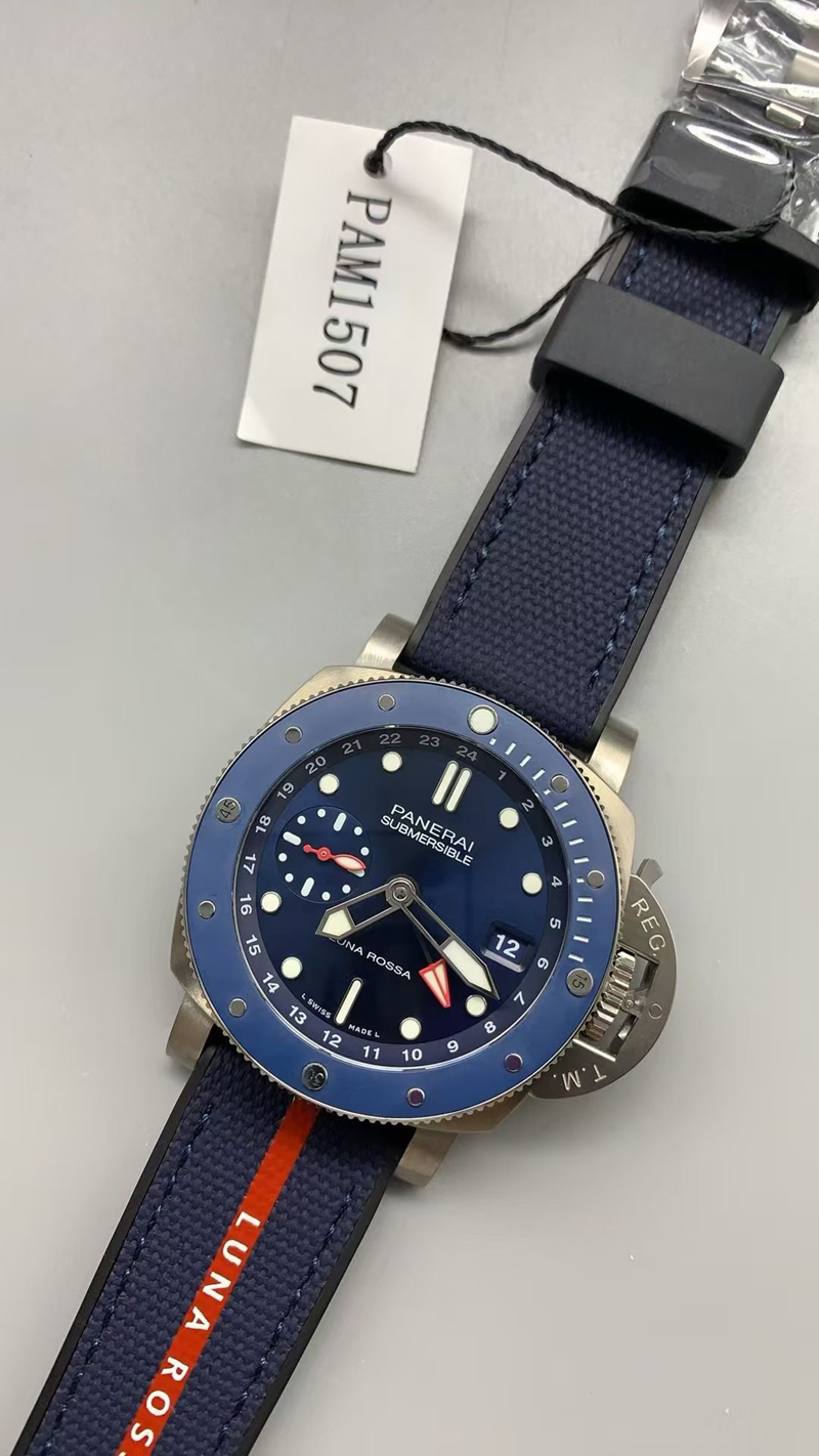 VS厂手表官网推出沛纳海PAM1507潜行系列复刻表,GMT俩地时针的,红色的指针,左边小盘里面是秒针,单向旋转的陶瓷圈口。